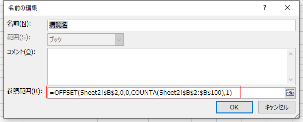 すると、上記のように手動で病院名のセル範囲を変更する必要がなくなります。