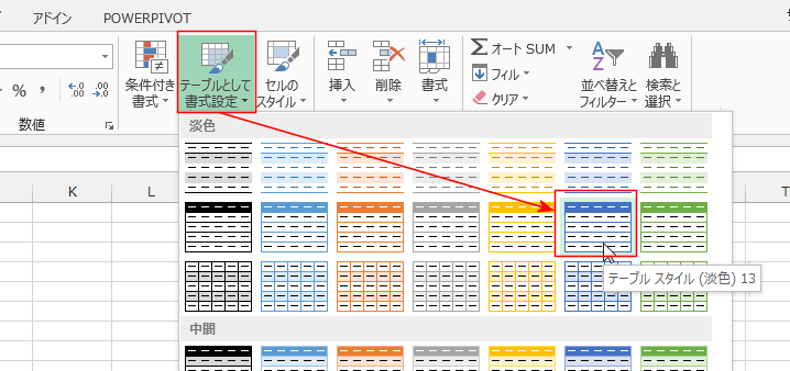 データのセルを1つ選択して状態で、[ホーム]タブの[テーブルとして書式設定]→[テーブルスタイル(淡色)13]を選択しました。
