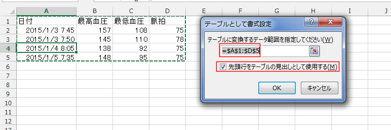 「先頭行をテーブルの見出しとして使用する」にチェックが入っているのを確認します。