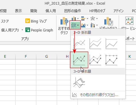 - テーブル内のセルを選択した状態で、[挿入]タブの[折れ線グラフの挿入]→[マーカー付き折れ線]を選択しました。
