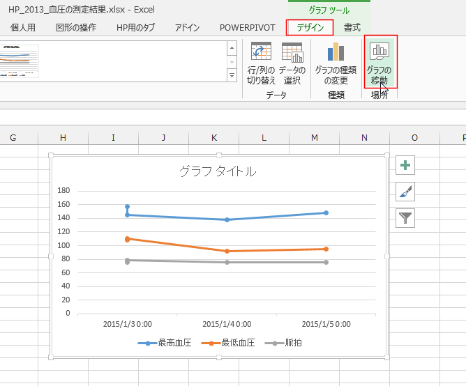 グラフを選択して、グラフツールの[デザイン]タブの[グラフの移動]をクリックします。