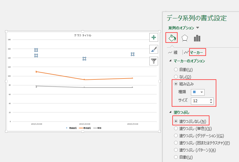 - データ系列の書式設定ウィンドウのマーカーを選択して、マーカーの書式を設定します。