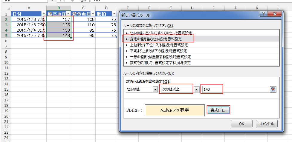 「セルの値」「次の値以上」「140」と設定しました。