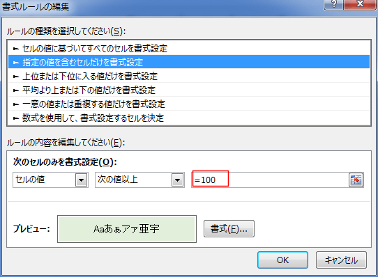 「セルの値」「次の値以上」「100」と設定しました。
