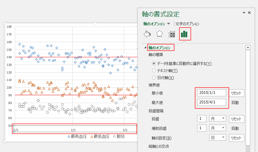 軸のオプションで境界値の最小値と最大値を任意に変更することができます。