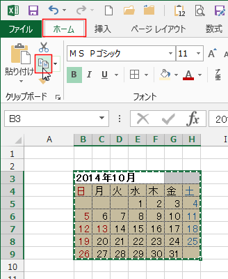 - 表の部分を選択して、[ホーム]タブの[コピー]を実行します。