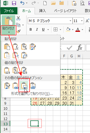 - 貼り付け先のセル B12を選択して、[ホーム]タブの[貼り付け]→[図]を実行します。