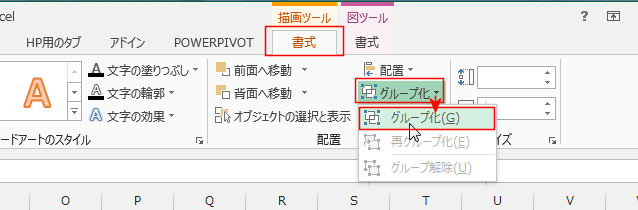 - 描画ツールの[書式]タブを選択して、[グループ化]→[グループ化]を実行します。