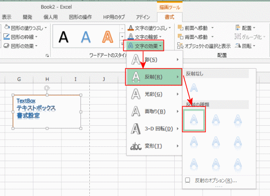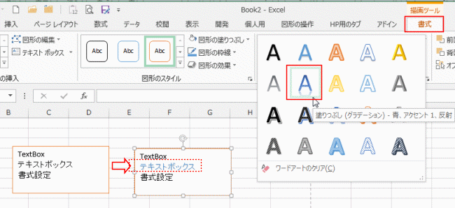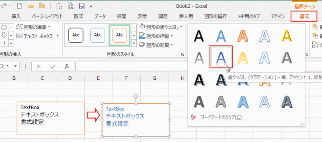 グループ名がちょっとわかりにくい・・・と感じますが、文字のスタイル変更(書式設定)はワードアートと共通の操作になります。
