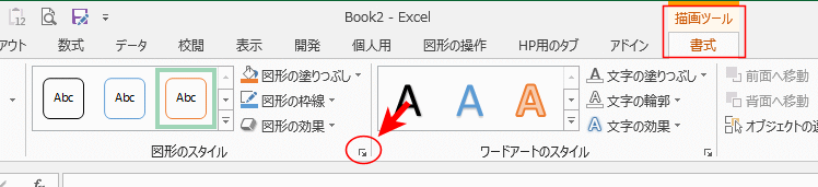 - 図形部分の書式を設定したいときは、図形のスタイルのスタイル グループにあるダイアログボックス起動ツールをクリックします。
