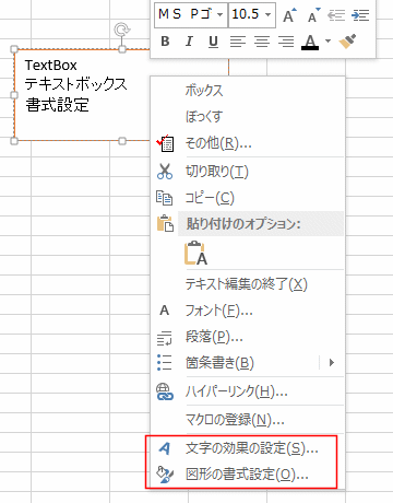 - テキストボックスの内部を右クリックすると、「文字の効果の書式設定」と「図形の書式設定」があります。