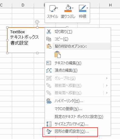 - テキストボックスの枠部分を右クリックすると、「図形の書式設定」があります。