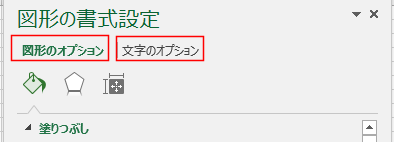 - ダイアログボックス内で図形のオプション/文字のオプションを切り替えるタイプになっています。