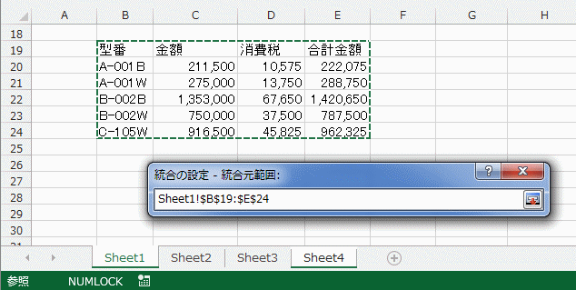 下図のように各シートのデータ部分だけを統合元に登録します。