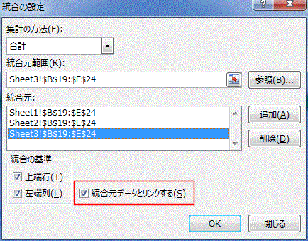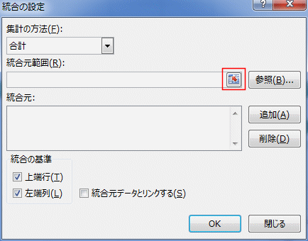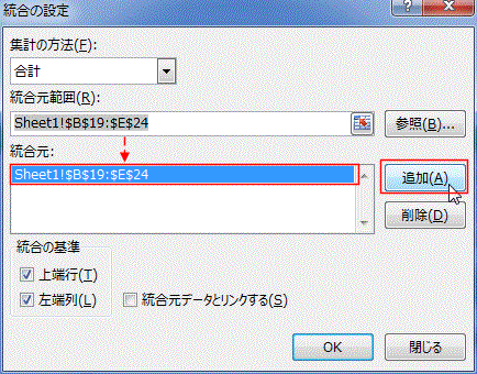 - [追加]ボタンをクリックして、統合元に統合元範囲を入力します。