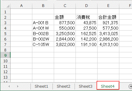 - Sheet1〜3のデータは同じセル位置で、同じように並んでいます。