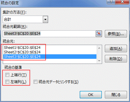 統合の基準の「上端行」と「左端列」にチェックを入れます。