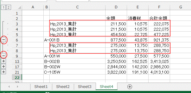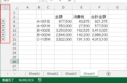 - アウトラインのレベル ボタンをクリックして展開すると、統合元のデータが表示されます。