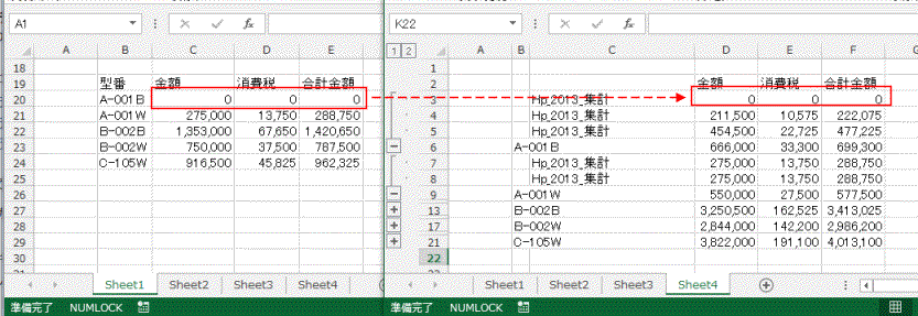 3D-集計(串刺し演算)では同じセル位置同士を計算するので、この辺がちょっと異なります。