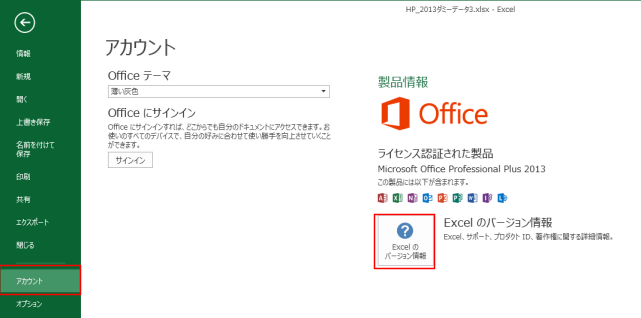 - 「アカウント」を選択します。「Excelのバージョン情報」ボタンをクリックします。