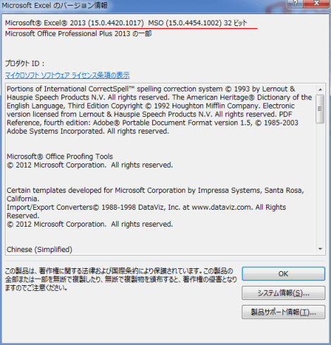 - 最上部に「Excel2013」というのが見えます。かっこ内にビルド番号(15.0.xxxxxx)が表記されています。