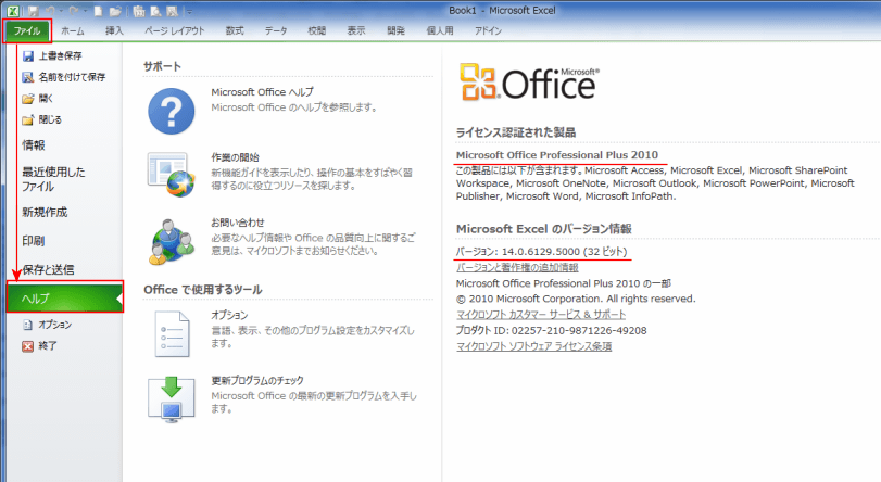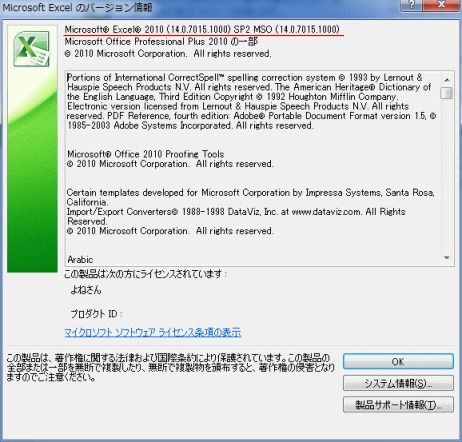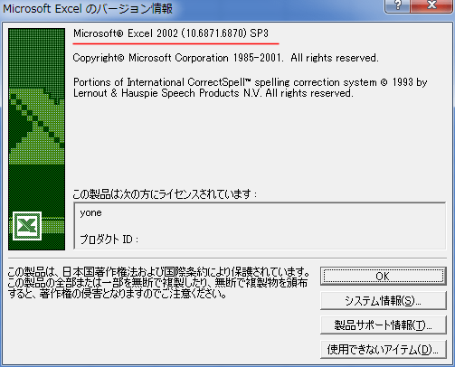 - Excel2002と表示されます。ビルド番号は 10.xxxxxx と表示されています