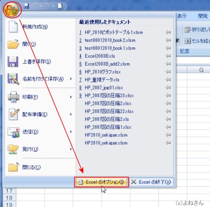 - Officeボタンをクリックして、[Excelのオプション]を実行します。