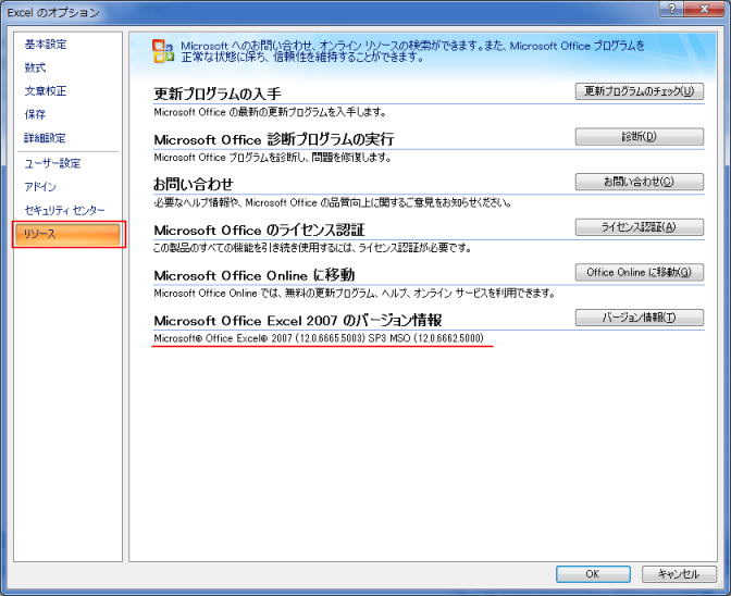 - [リソース]を選択すると、Excel2007と表示されます。ビルド番号は 12.0.xxxxxx と表示されています