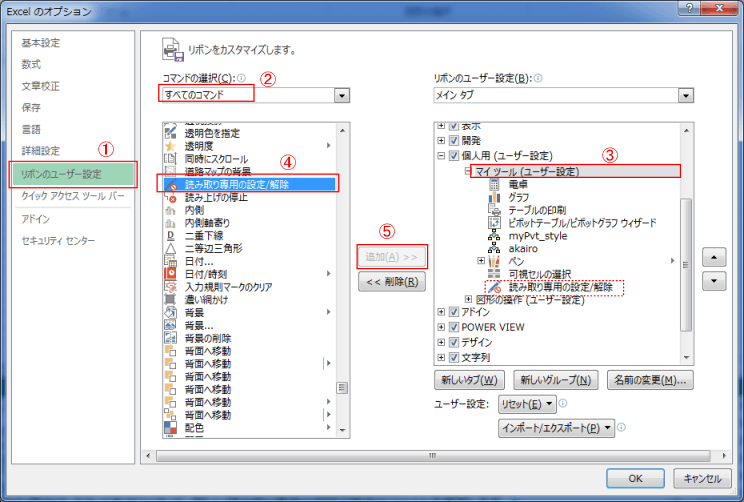 - [読み取り専用の設定/解除] というコマンドボタンをリボンに登録して利用することもできます。