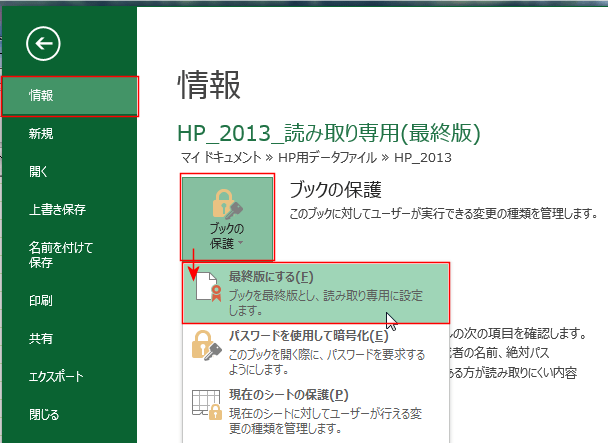 - [情報]を選択して、[ブックの保護]→[最終版にする]をクリックします。