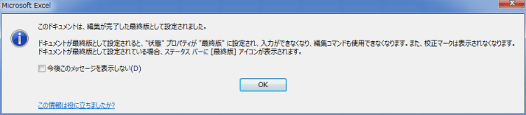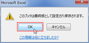 - 「このブックは最終版として設定され保存されます」とダイアログが表示されますので、[OK]ボタンをクリックします。
