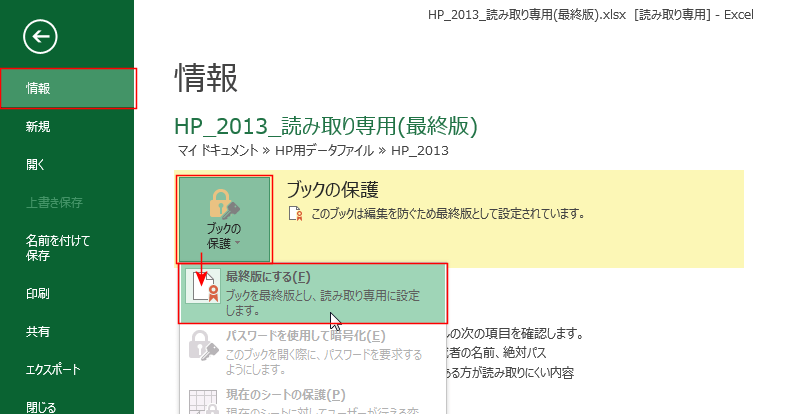 - 「最終版にする」「読み取り専用で開くことを推奨する」「読み取り専用にする」といった設定があり、それぞれ微妙に違いがあります。