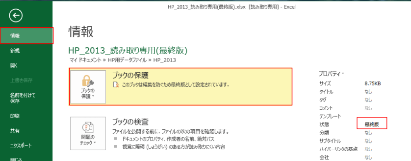 - [情報]を選択すると、[ブックの保護]に「このブックは編集を防ぐため最終版として設定されています。」と表示されています。