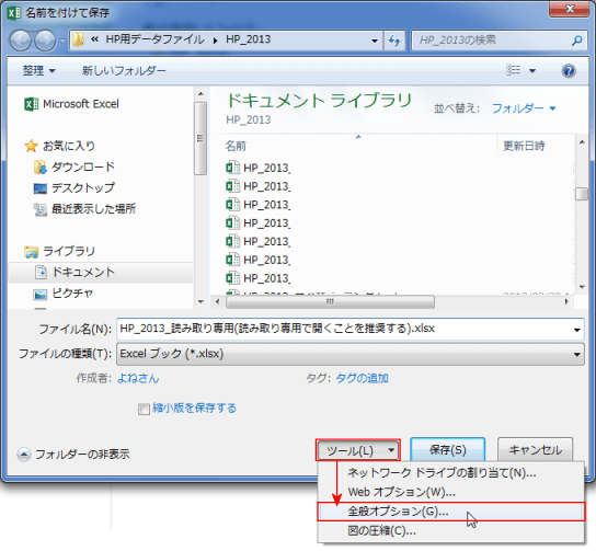 - 「名前を付けて保存」ダイアログボックスの[ツール]ボタンをクリックして、[全般オプション]を選択します。