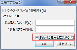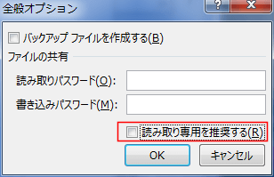 - 「全般オプション」で「読み取り専用を推奨する」にチェックを入れ、[OK]ボタンをクリックします。