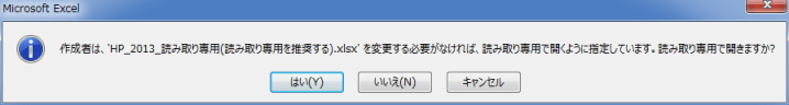 - 「作成者は (ファイル名)を変更する必要がなければ、読み取り専用で開くように指定しています。読み取り専用で開きますか?」と表示されています。