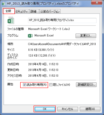 - [全般]タブを選択します。「読み取り専用」にチェックを入れ、[OK]ボタンをクリックします。