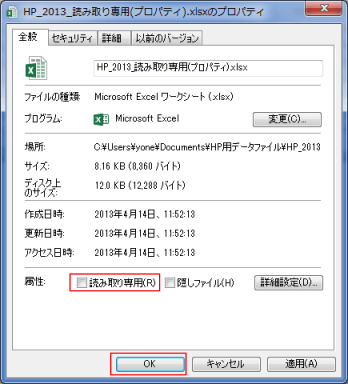 [全般]タブを選択します。「読み取り専用」にチェックを外して、[OK]ボタンをクリックします。
