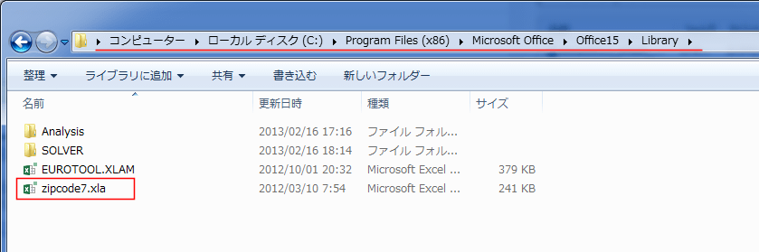 - ダウンロードした zipcode7.xla をC:\ProgramFiles(x86)\Microsoft Office ¥Office15