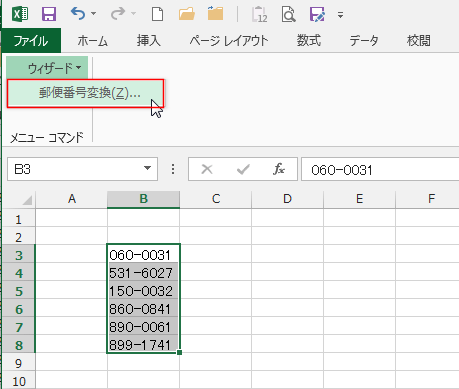 - 「アドイン」タブにウィザード]→[郵便番号変換/...]が表示されました。