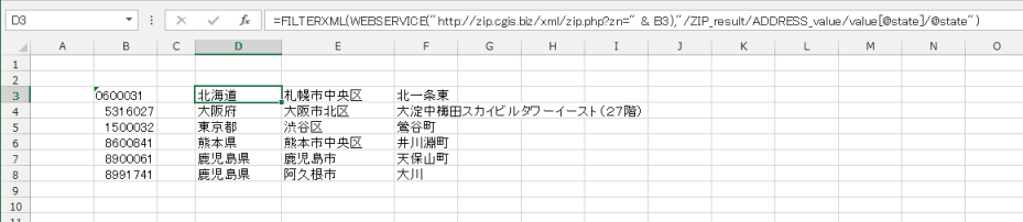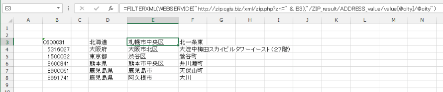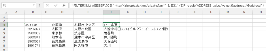 この関数を使うと住所を求めることができますが、計算の度に先方へ問い合わせることになりますので、結果が得られたら値の貼り付けで、数式を値に変換するのがよいと思われます。