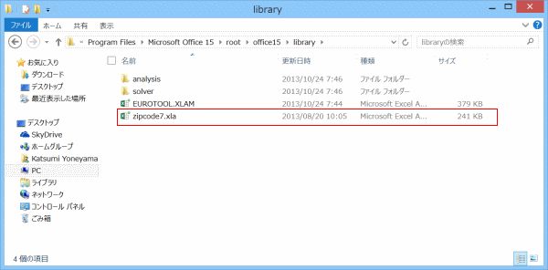 - zipcode7.xla をC:\ProgramFiles\Microsoft Office 15 \root ¥Office15 ¥Library にコピーしました。