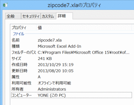 - zipcode7.xlaのプロパティ