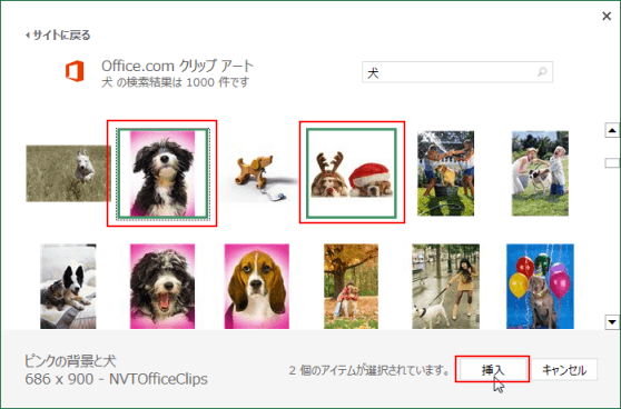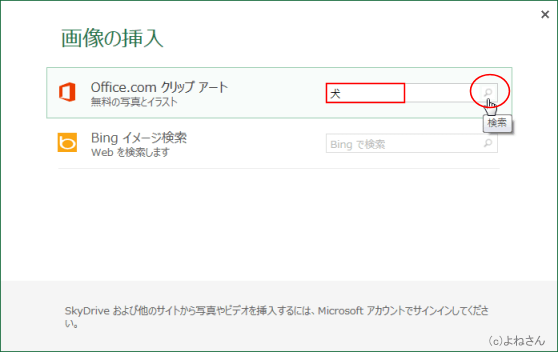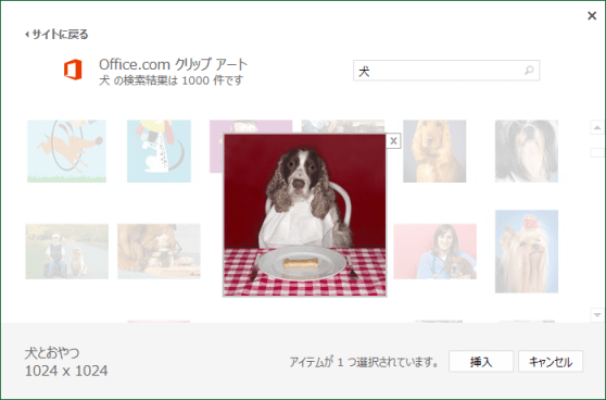 - 下図では、Office.comクリップアートの検索ボックスに「犬」と入力しています。