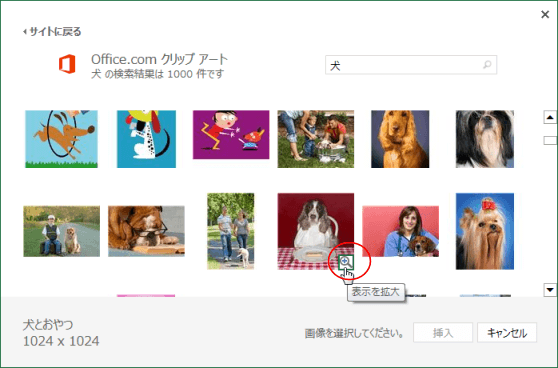 - クリップアートにマウスポインターを乗せると、右下に[表示を拡大]ボタンが表示されます。