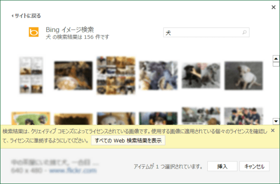 - 「使用する画像に適用されている個々のライセンスを確認して、ライセンスに準拠するようにしてください。」との注意書きが表示されました。