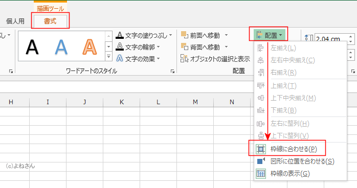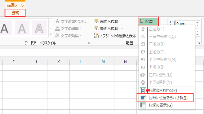 - [描画ツール]リボンの[書式]タブを選択し、[配置]→[枠線に合わせる]をクリックして、オンにします。