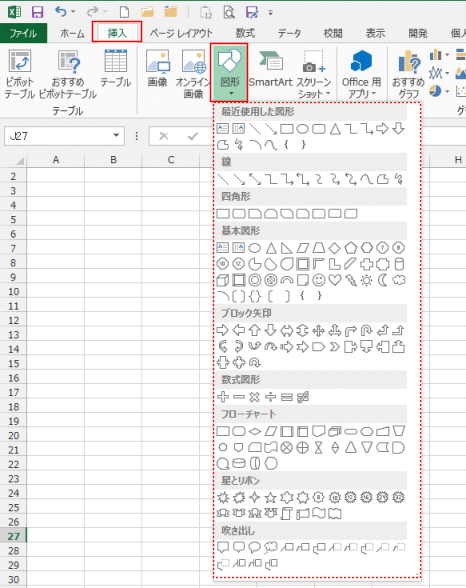 - [挿入]タブの図グループにある[図形]をクリックすると、使用できる図形がリスト表示されます。