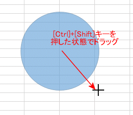- [Ctrl]+[Shift]キーを押した状態でドラッグすると、ドラックの開始位置を中心にして縦横比を保った形状の図形を挿入することができます。