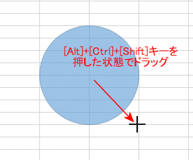- [Alt]+[Ctrl]+[Shift]キーを押した状態でドラッグすると、ドラックの開始位置を中心にして縦横比を保った形状の図形を枠線に合わせて挿入することができます。